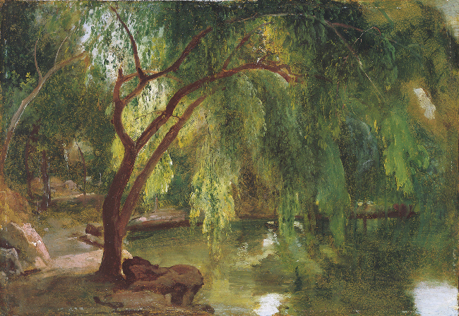 Al lado de las aguas está, como leyenda, En su jardín murado y silencioso, El árbol bello dos veces centenario, Las poderosas ramas extendidas, Cerco de tanta hierba, entrelazando hojas, Dosel donde una sombra edénica subsiste.
